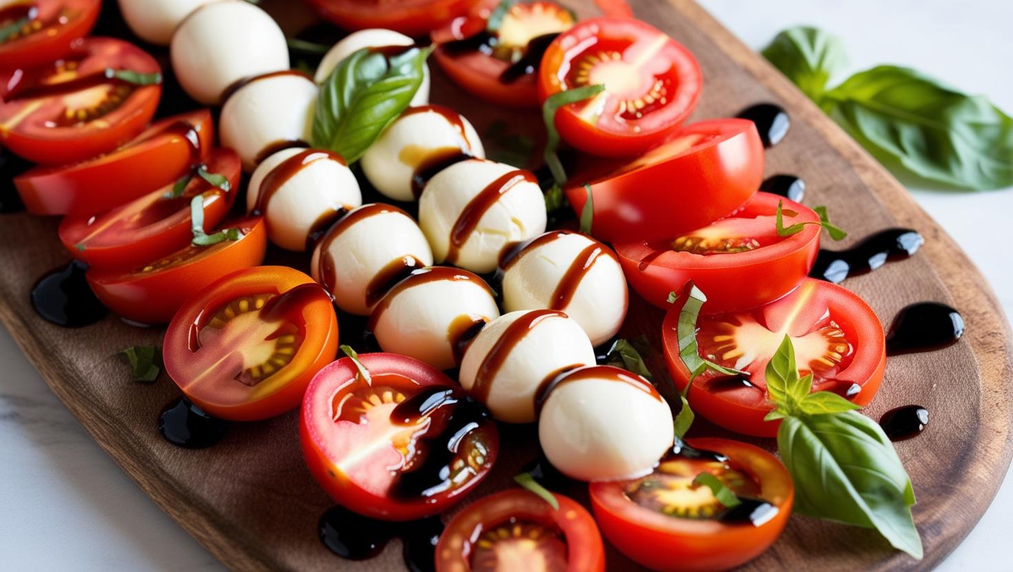 - 체리 토마토 15개, 모차렐라 치즈 1개, 바질 잎 10장, 엑스트라 버진 올리브오일 3큰술, 발사믹 글레이즈 2큰술, 소금 약간