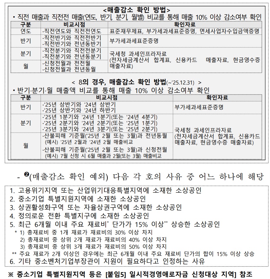①연매출 1억 4백만원 미만이고 ②업력 7년 미만이면서 ③일시적경영애로 사유(➊매출감소 확인, ➋매출감소 확인 예외)가 있는④ 소상공인